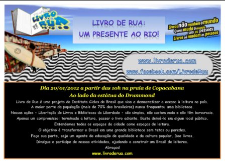 Haverá também contação de histórias por parte da Taberna dos Bardos, projeto irmão do Livro de Rua, que tem por objetivo não só divertir crianças e adultos, mas despertar nas pessoas o interesse pela leitura.Como já é praxe em nossas atividades, os livros são de graça e não háqualquer burocracia. Apenas um compromisso: terminada a leitura, passá-los adiante para um conhecido, amigo ou parente, ou deixá-los em um local público, como bar, padaria, farmácia etc. Ler e passar adiante é o slogan do Livro de Rua, que no ano passadodistribuiu mais de 5.000 livros, a maior parte em regiões de baixa renda. Em quatro anos, o projeto de democratização da leitura, ligado ao Instituto Ciclos do Brasil, distribuiu gratuitamente 13 mil livros.